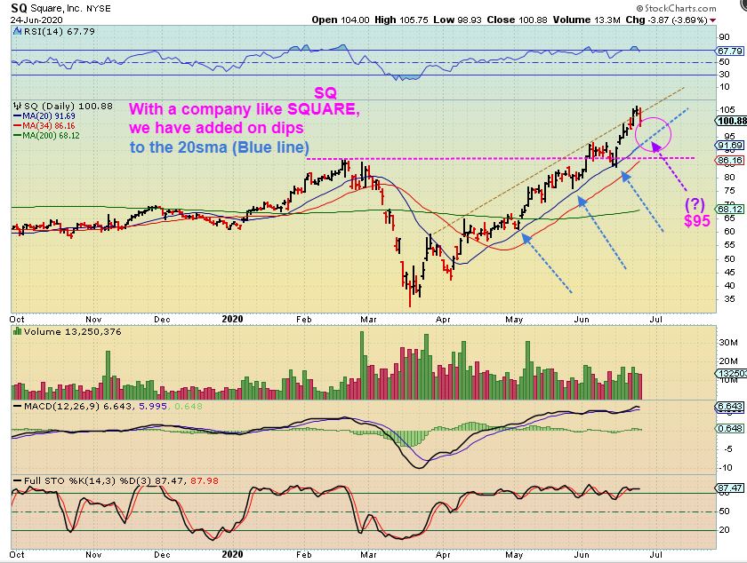 “It has been a great run, I don’t want to lose gains. Would you sell or raise stops or even add?”  Answer: We are near the timing for a dip into a dcl to start. A dip to the 20sma is normal for SQ. I would say that You must decide to either sell some at these highs (?) & try to buy back at the 20sma?  However,  if selling picks up & it breaks down further, you could sell all or 1/2 or really whatever you want.  You have enough gains to play this a number of ways.  You could even sell it all, be happy, and re-buy if it dips and reverses at the 20sma at the market dcl.