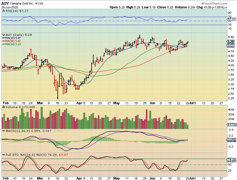 AUY  – Many of these look very much like BTG. They are Bullish and a stop under the red 50 sma line should be  a protection.