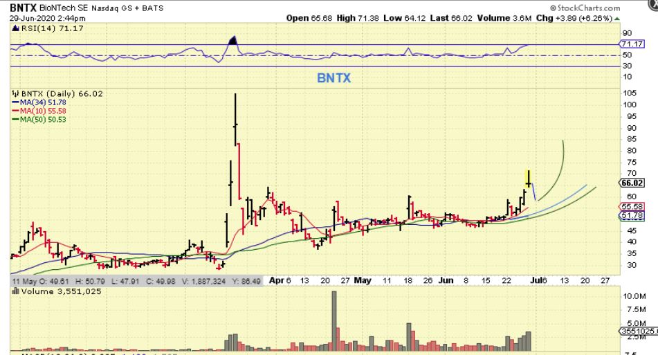 BNTX  was up nicely Monday morning, but it sold off as the day went on. That move was basically $50 to $70 and I dont think that it is finished yet, so if it pulls back & fills that gap, I may look for a reversal to add to my position.