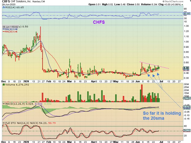 CHFS – On Monday it did not drop to the 50sma, but it has been holding above the 20sma. It looks quite close to a break out & still looks to be bullishly under accumulation.