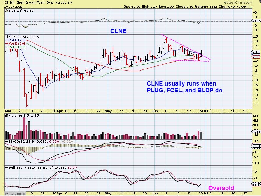 There are 4 stocks that I have under ‘Clean Energy’ in my watch list, and they almost always run together.  They are PLUG, BLDP, CLNE, and FCEL.  Well here we see that PLUG AND BLDP have been ramping higher, so what do CLNE & FCEL look like?…