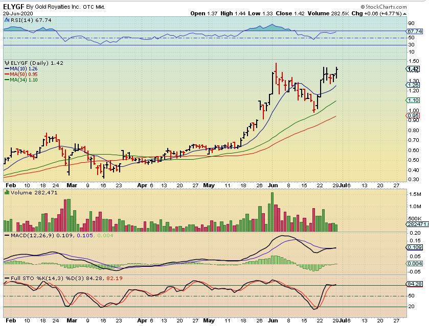 ELYGF – I own ELYGF and it was up another 5% Monday.  You could call this a mini daily cup & handle,  and it looks ready to break out.  I really want to see more volume on the break out than I saw on Monday, to indicate that buyers are piling in.  The MACD & RSI are not confirming this push higher at this point.