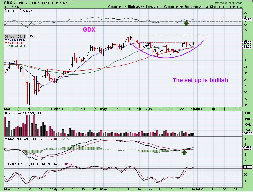 Nothing really changed from the weekend report, but it was good to review the daily charts and see how things look after Mondays trading.  The Covid related stocks ( BNTX, HTBX, SXTC, COCP, NVAX, etc ) started out doing very well Monday morning, but then some sold off a bit.  I still like the set ups in that area.  Miners started off red, but reversed higher as the day went on, so we’ll see if Tuesday gives us some upside in the Precious Metals, and I’ll do a little review of some Miners below.