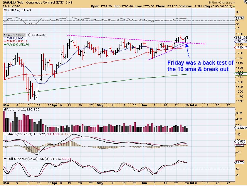 On Friday GOLD dropped, back tested the upper trend line & the 10sma, and then flipped higher.  That actually looked perfect and this really looks like a bullish set up.  We can now raise a stop under Fridays lows.  Monday saw very little progress, but I’d like to really see this take off higher.