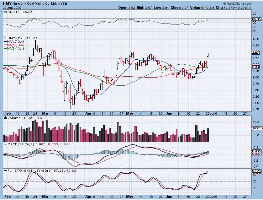 HMY – Gapped open and closed near the highs, so it does look like HMY will play catch up. It had increased volume too.
