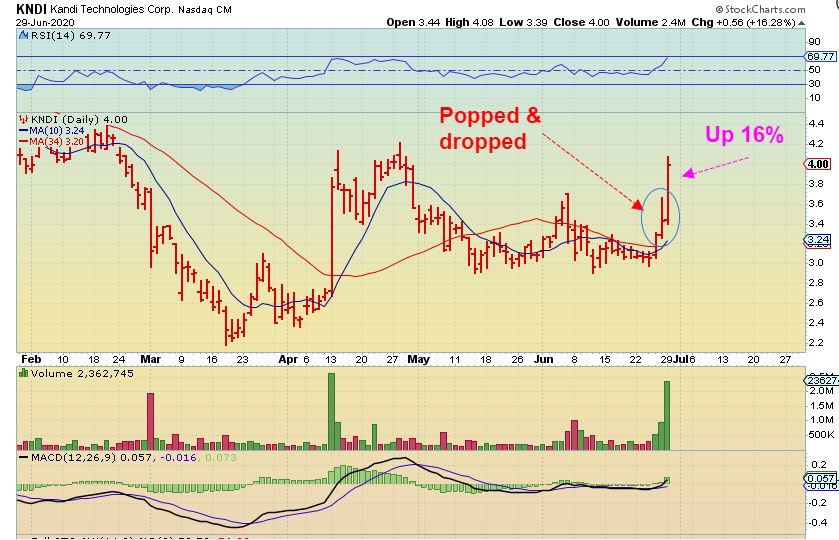KNDI – I Just wanted to stick this chart in here too, to show the same ‘rally that sells off candle‘,  followed by a nice day higher the following day.