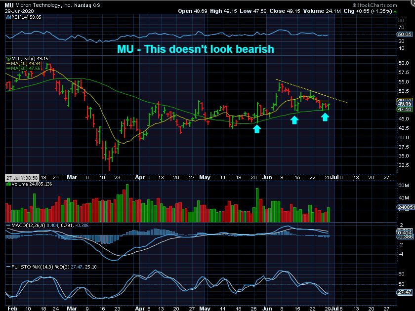 MU  (& a few others) remained Bullish so far and actually looks like it wants to break higher and rally out of a long consolidation.   That gives us a mixed bag and I’ll have to continue to monitor things, especially as the Markets finish up the 2nd daily cycle.