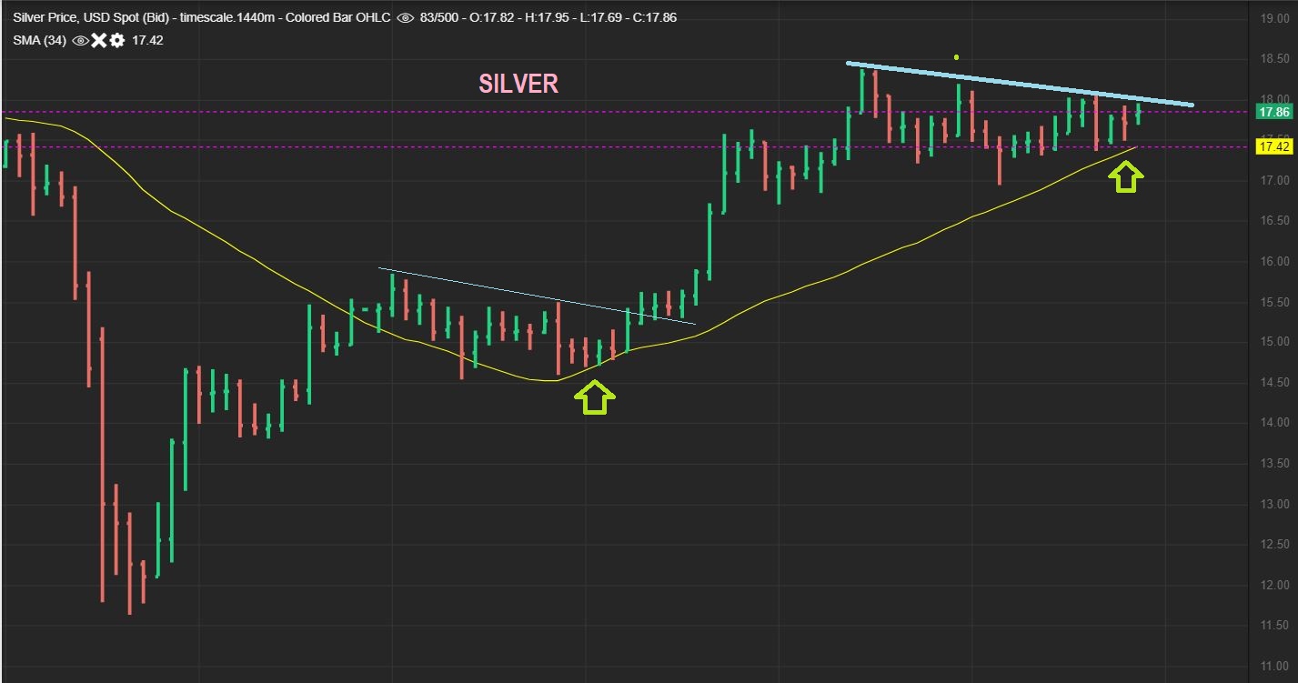 SILVER is still a Bullish set up too. It has been a multi-week consolidation moving price over to the 34 sma. That is where it landed before the last Rally. I would think that a stop below the 34 sma would be enough protection. Price shouldn’t go there.