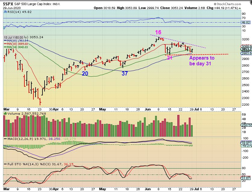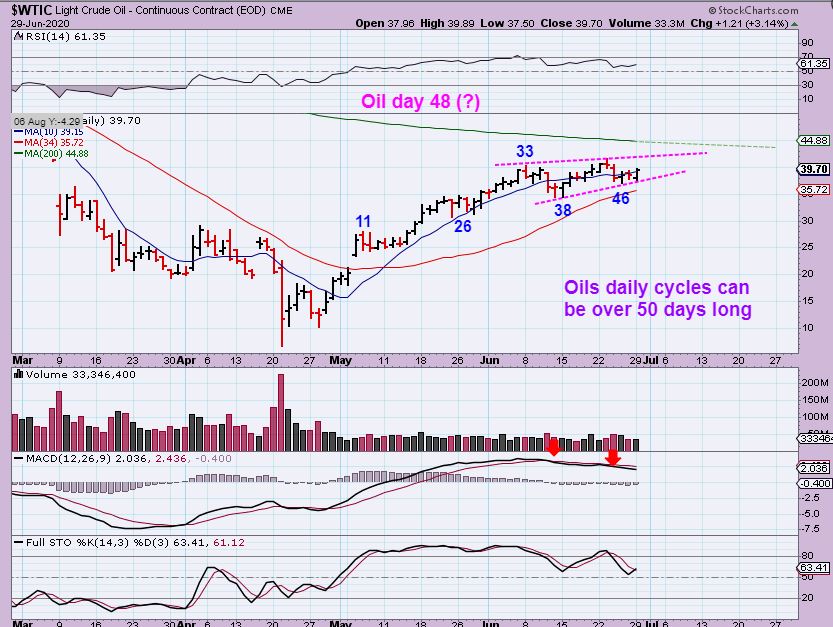 XOP – After a false break out through the overhead  200 sma, that became a day 16 peak in the 2nd daily cycle. The XOP dropped and we are almost at a point where we view it as L.T. ( left translated) and that indicates a weakening set up. That could affect the overall strength of the 3rd daily cycle.
