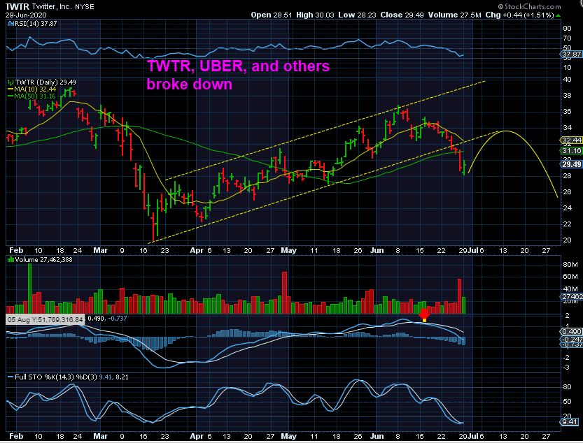 TWTR – We can see a break down below the channel, and a reversal on Monday. So the ones that dropped like this  could recover over time, or it may just back test that break down and roll over (as drawn here).
