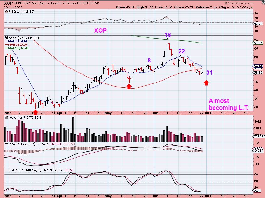 WTIC DAY 48 -As time goes on I would  think that we need larger moves during each day. To me this looks kind of bullish right now. Was that a short day 38 dcl?  I DON’T THINK SO,  but this looks like it is preparing to break out above the 200sma.  The XOP has had a deeper pull back