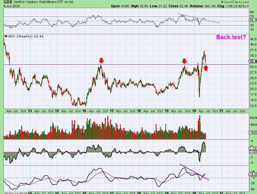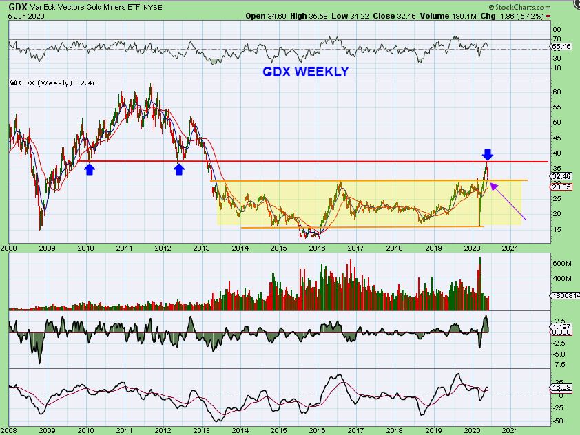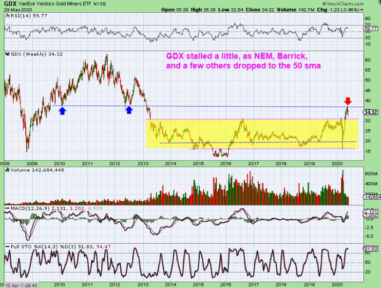 GDX WEEKLY MAY 29 On this chart Last weekend we tagged a resistance area  and started to drop.  It looked like we would back test that yellow base area.