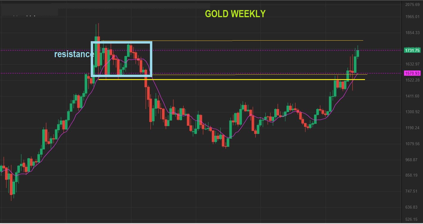 GOLD WEEKLY   -That call for consolidation makes sense.  Last week I showed on the following WEEKLY and MONTHLY CHARTS that we have room to get to upper resistance near $1750-$1775. Price can stall in this resistance area, or break out and back test…