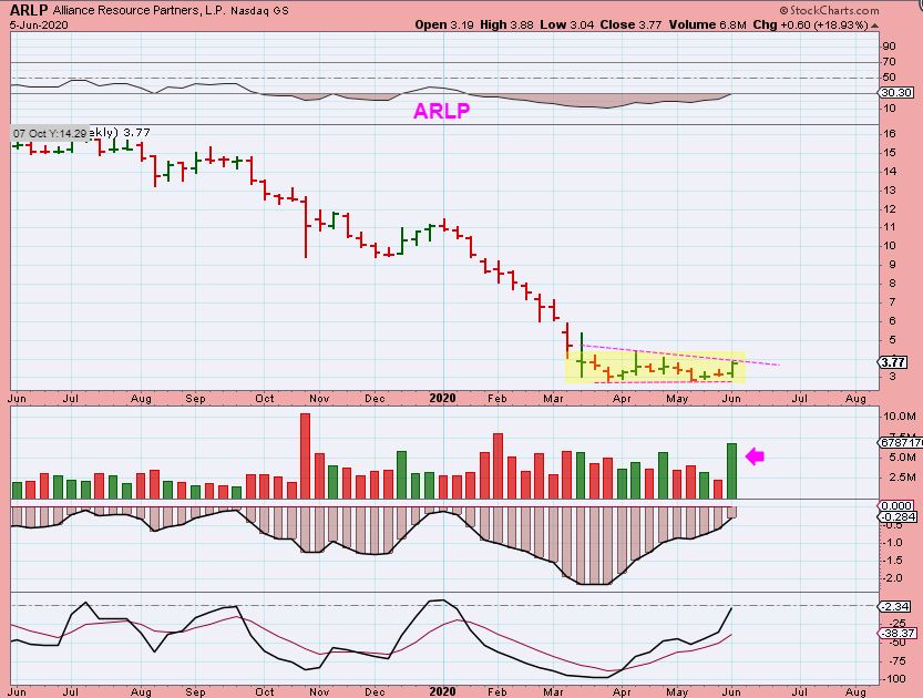 APA – This is Bullish and was in my reports.  It was rather orderly consolidation above the 34 sma , triangle forming,  price into the apex was great. We already bought it in March and made good gains, it looked ready for leg up #2.  I posted it in a few reports last week actually with OKE, MRO, OAS, CPE, HLX, etc etc .  This was a possible $10 to $20.