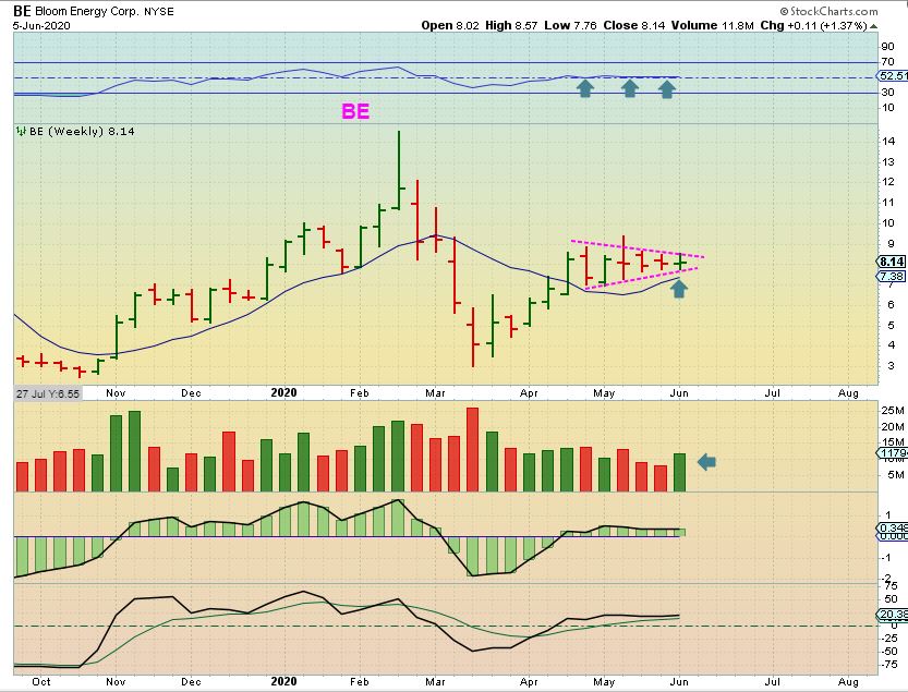 MRO & BE were laggers – MRO then popped 37% last week, BE did not  (yet).  THIS IS BE RIGHT NOW AS A LAGGER, and this is another bullish set up.  It is a buy with a stop under $7.  THAT is a big risk, but the reward is a run to $14, almost 100%.
