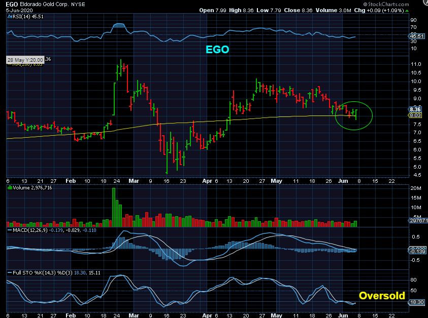 EGO regained the 200sma on a big Gold down day . Gold was down $30,  EGO reversed.