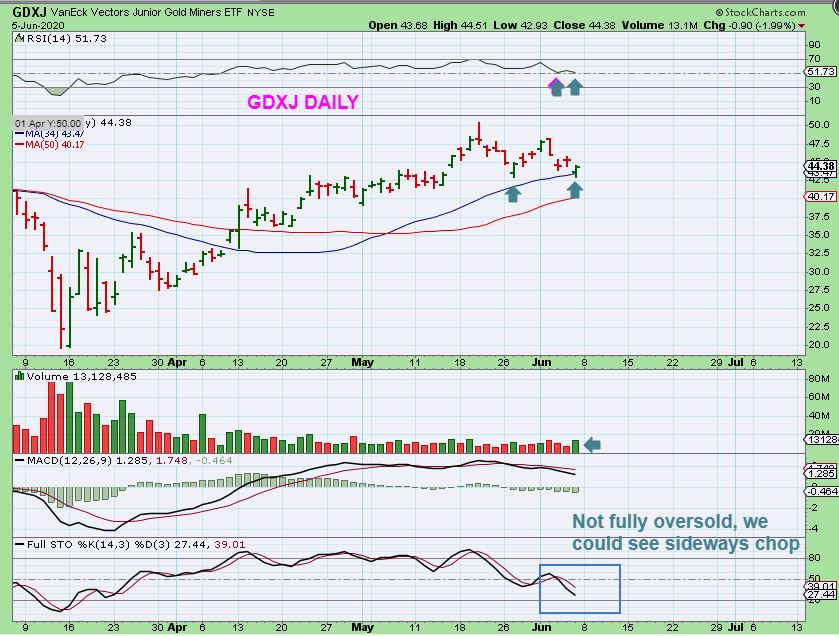 GDXJ – I grabbed a  daily chart of GDXJ to show a small reversal that took place Friday. It reversed at the 34 sma, and is in line with a reversal from the week before too.   This is good, buyers stepped in.  So we have now had 2 weeks of bounce – drop – bounce – drop, yet we may get 1 more week of that, because this is not oversold.  Let me show you how that MIGHT look too …