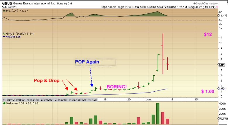 GNUS DAILY  – We saw  GNUS run from 30 cents to $1.00 (similar to OAS?) in May,  It then dropped & chopped for 4 days and then ran again, to $2.00   That is HUGE gains. Then you ask me, “Should I sell?”  and I say 30 cents to $2?  Sure.  Then it went sideways for weeks and RAN TO $12?  This just happened over the past month.  So I always say that with these moves you have choices, and I DO NOT KNOW how it will play out for sure.