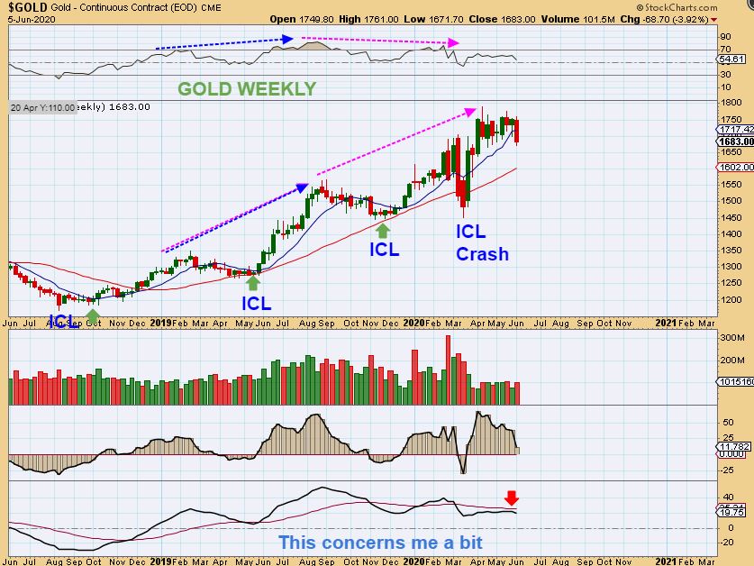 GOLD WEEKLY  – I have to be honest here:  I do not love the choppy sloppiness at the highs .  It looked fine right up to last week, and it is still “ok”, but this week Gold lost the 10 week MA and about 75 points. It does NOT hurt the big picture, but it may call for consolidation , so…
