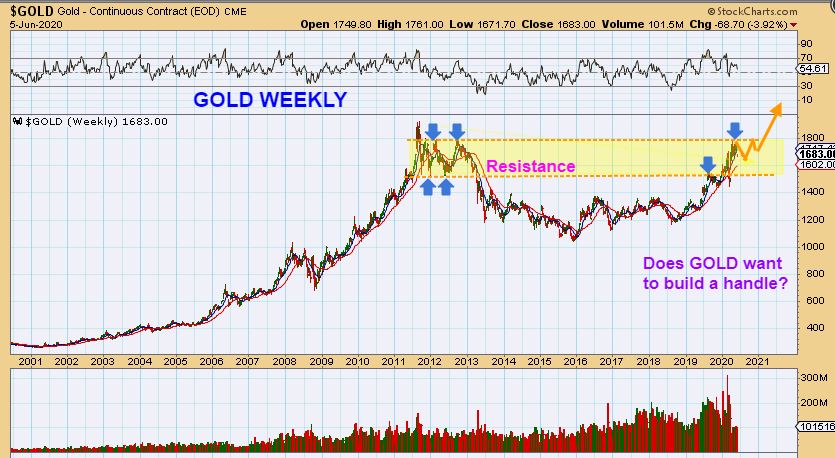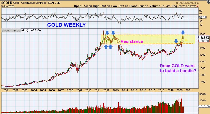 GOLD WEEKLY NOW :  We are in that upper area and have dropped this week by $75.  DOES THIS WANT TO CHOP FOR THE NEXT DAILY CYCLE AND BUILD A HANDLE, INSTEAD OF BREAKING OUT?  Read the chart…It is possible.