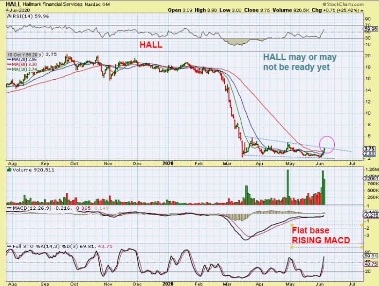 SO THEN I MENTIONED THIS THURSDAY :  HALL is another that I entered  ‘AS A TRADER’. These can chop sideways for weeks, so I don’t always recommend them here,  but while I wait for Miners to run again, I do some side trading.  If you have been here for a while, you know how much I love LONG TIGHT BASES with increasing volume on the Pops.