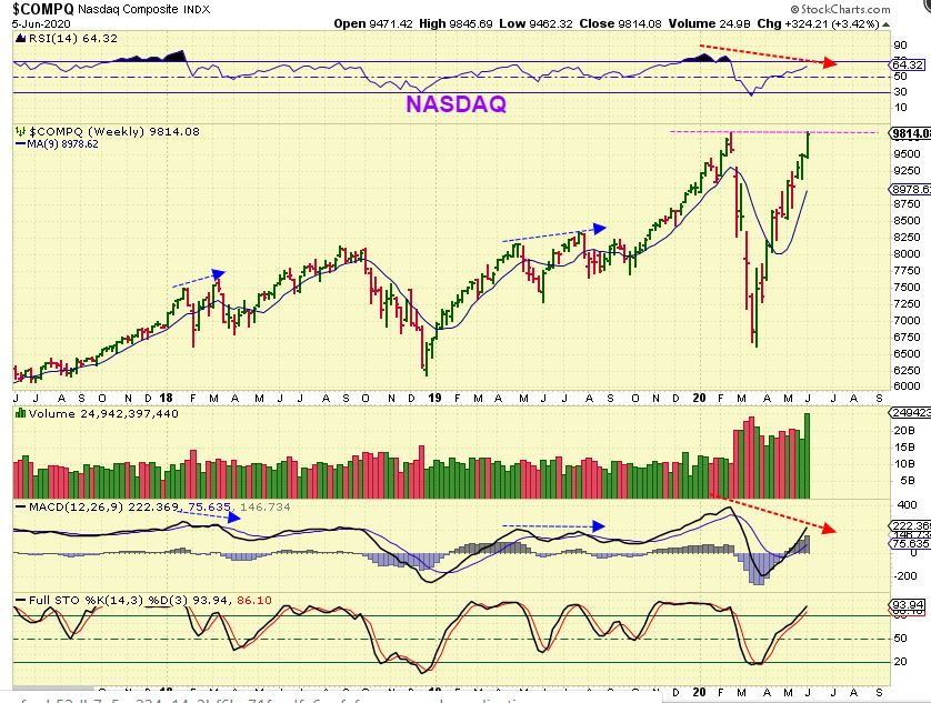 We saw the General Markets chopping sideways from April through May, but have started to break higher and even the Tech Stocks that we have been following look ready for another leg higher. All of this despite the closing of business, Corona virus stay at home orders, Government bail outs, etc?  Well,  it doesn’t always seem to make a lot of sense, but we follow the markets lead and try to profit.   STEP – BY – STEP , it is possible that  The General Markets MIGHT be setting up for a blow off top.  Interesting.