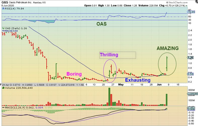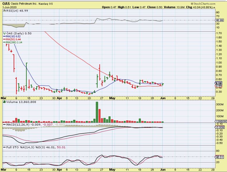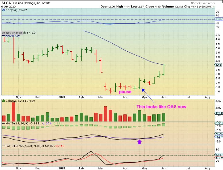 OAS – If you have been here for a while,  you know I love flat tight bases like OAS had in March and again in May.  Last week I said that I liked this flat base, riding the 50sma, and I bought it. I bought it & you can Buy it with a stop under the 50sma somewhere.  SO…