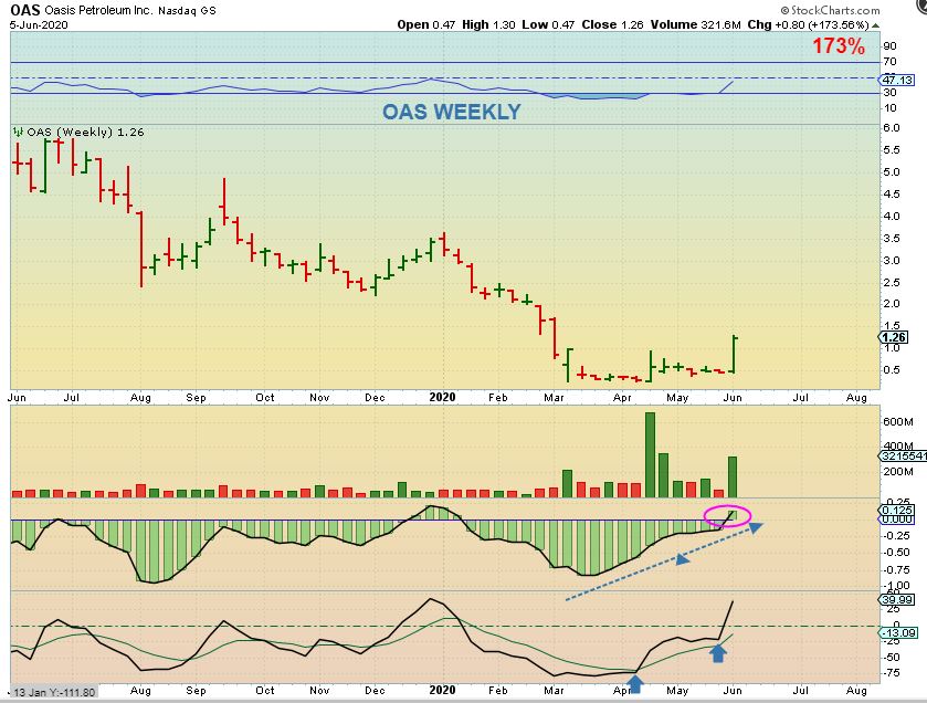 OAS WKLY-   IT POPPED Up 100% FRDAY,  173% for the week!!   “Where do I sell?”  Yes, I know, I am wondering the same thing.  I have seen bases like this POP & RUN,  or Pop & Drop & chop & Pop & Chop , etc .   Well, I usually sell ‘something’- maybe 20% if my position is fairly big.  I like to then let some run for a while.  That said…. I am just going to discuss this quickly. Let me show you something about these POPS .