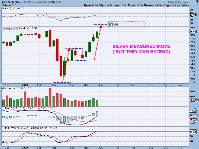 SILVER WEEKLY FROM LAST WEEKS REPORT   – ON STOCKCHARTS I was looking at the $19+ area as a next price target area to complete the measured move, So I was thinking that Silver could run their last week.