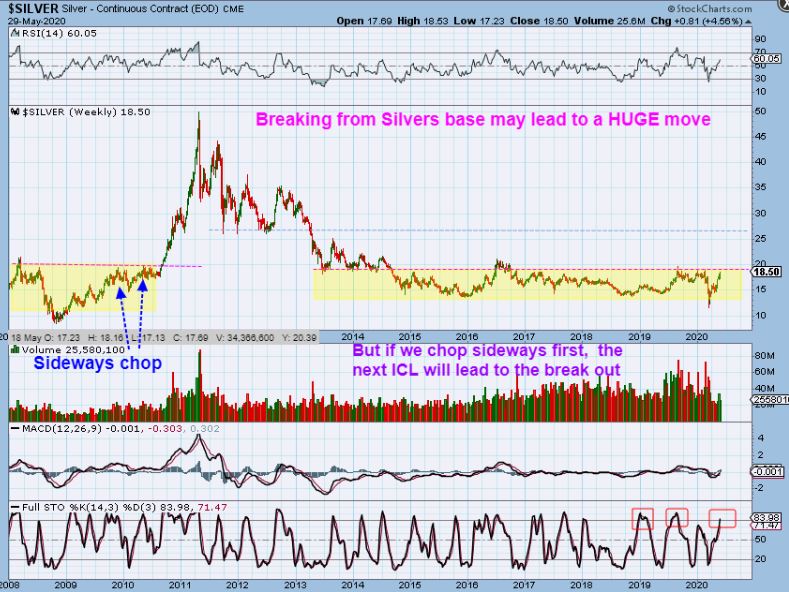 SILVER WEEKLY BIG PICTURE  MAY 29 – Last week I showed this Base in Yellow and the top is resistance.  We did not break out yet.  If you read this chart, I mentioned that at this area in 2010 – we chopped sideways first, so we COULD chop sideways here too.  Read the chart.