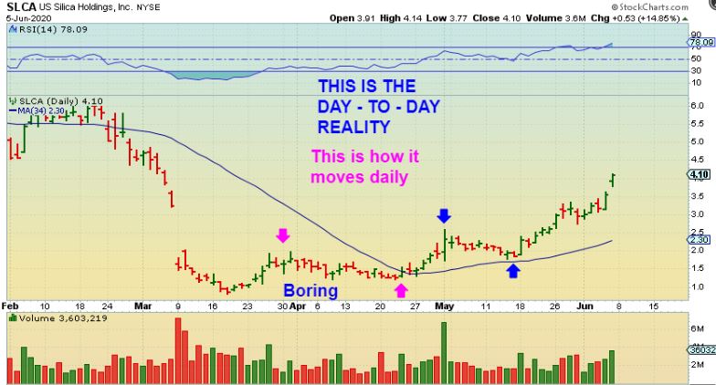 SLCA 6 – Boom Boom Boom,  this was one of our energy stocks and it overall from  $1 to $4.  That was all in Mid-March to early June.  Not bad for 2.5 months , but you have to admit, that was NOT an easy ride.  That chop would have me second guessing myself for holding too.    That is why I try to take some off of the top, and let some ride.   That said…