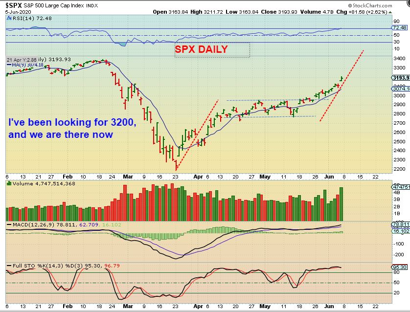 SPX  WEEKLY – This is where I got my 3200 target. It puts us at the top of the long term channel. One thing that stands out is the Large Candle last week alone.  Wow. I don’t see another candle even close to being that big in the normal run (except for that V-Bottom low). If we move higher next week, we move above this channel.  THEN we could be setting up for a blow off top!