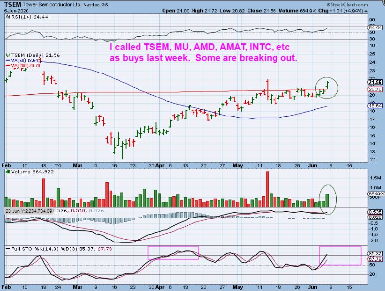 NOTE:  TSEM  –  One of the main reasons why I think the markets will continue higher is that after some consolidation, I started seeing ‘Buy Set Ups ‘ in the semiconductor and other tech Stocks.  I put those set ups in Thursday and fridays report.   Friday they did break out ( these were buys and should run higher).  ROCKY- You should be in a few  🙂