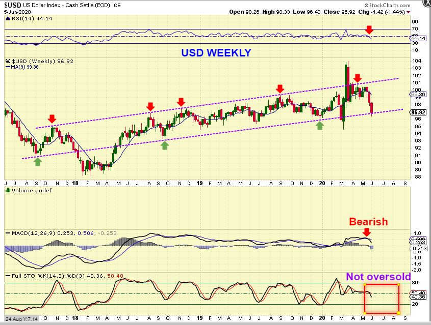 USD WEEKLY–  The USD is coming due for a dcl in the daily cycle timing, but right now it is at the lows of this channel.  It is looking like the USD wants to break down in this big Picture. We are At the lows, The weekly  RSI broke down, The MACD is crossing down, and we aren’t close to oversold. That may help Gold.