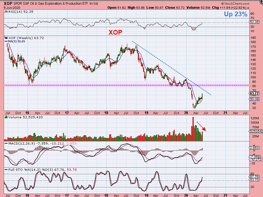 XOP WEEKLY -The Energy ETFs were rising nicely last week after a small sideways consolidation. They can quickly run in this 2nd leg right up to resistance ( or upside targets).  Resistance would be 70 or 80 for the XOP. Our Oil / Energy stocks are making Big Gains,  finding a few laggers may be the next best buy.