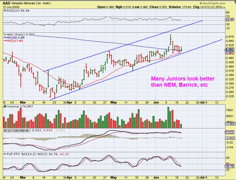 AAU DAILY  is steadily climbing and this also has a bullish look (unlike GDX & NEM), so some of these juniors still look very good, we are just waiting for a catalyst.  AAU went from $0.22 to $0.58 since March with out a Major pull back  ( just choppiness).   Doesn’t that make this a buy to you, if you don’t mind a low priced Miner?