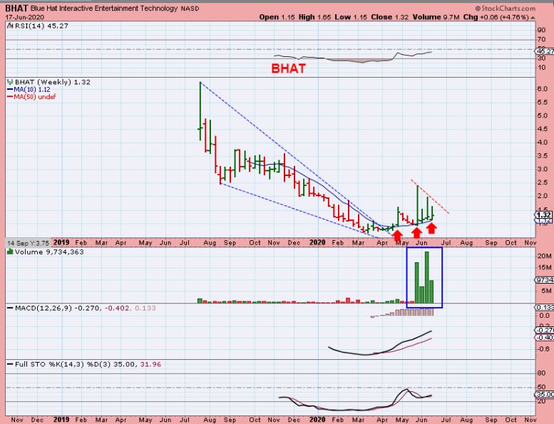 This BHAT WEEKLY CHART is also showing strong volume out of the lows. This is a very interesting chart to me, and on the daily chart it does rest near that 10sma.  I also have my eyes  & a small position on this one.