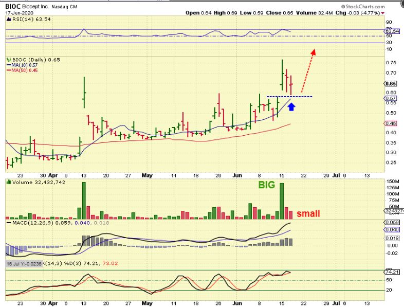 BIOCs Daily Chart shows the break out Gapped open, so BIOC may be trying to fill that gap, but it actually already is tagging that 10sma.  This is where it can move higher.  You can see that it has been bouncing into the close after each day of selling.  I sold 1/2 on the pop  & re-bought it , due to that weekly chart 50 week ma, and the bounce into the close after each drop.