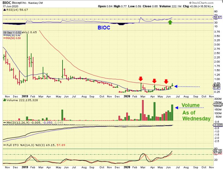 I have mentioned that I bought  BIOC as it was being pinched here under the 50 week ma.  Bioc actually broke out above that 50 week ma. So far it broke out and dropped back, but it remains quite bullish with the volume this week (as of Wednesday) , so go to the daily chart…