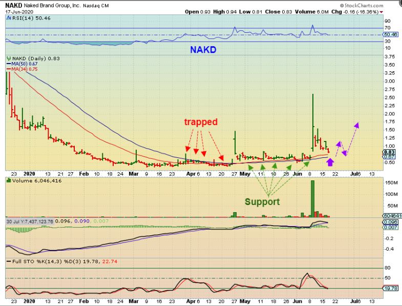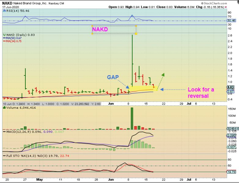 NAKD seems to be filling a gap and I am going to watch for a reversal. If it reverses, it may become ready to move higher again  (as long as the markets stay healthy).  I am keeping my eyes on NAKD again.