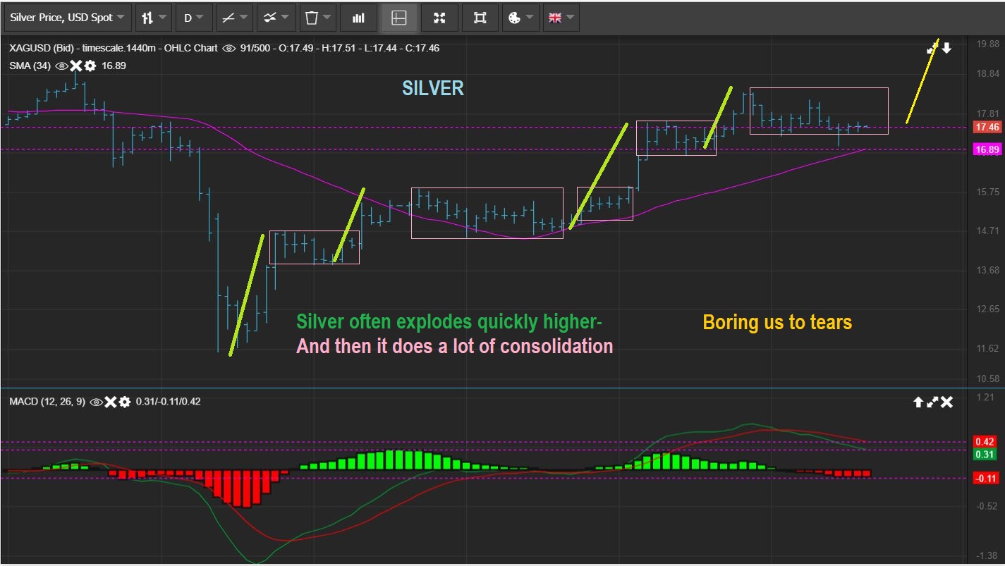 SILVER has also continued to chop sideways, but it does that often,  right before a nice quick run higher.