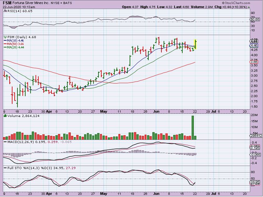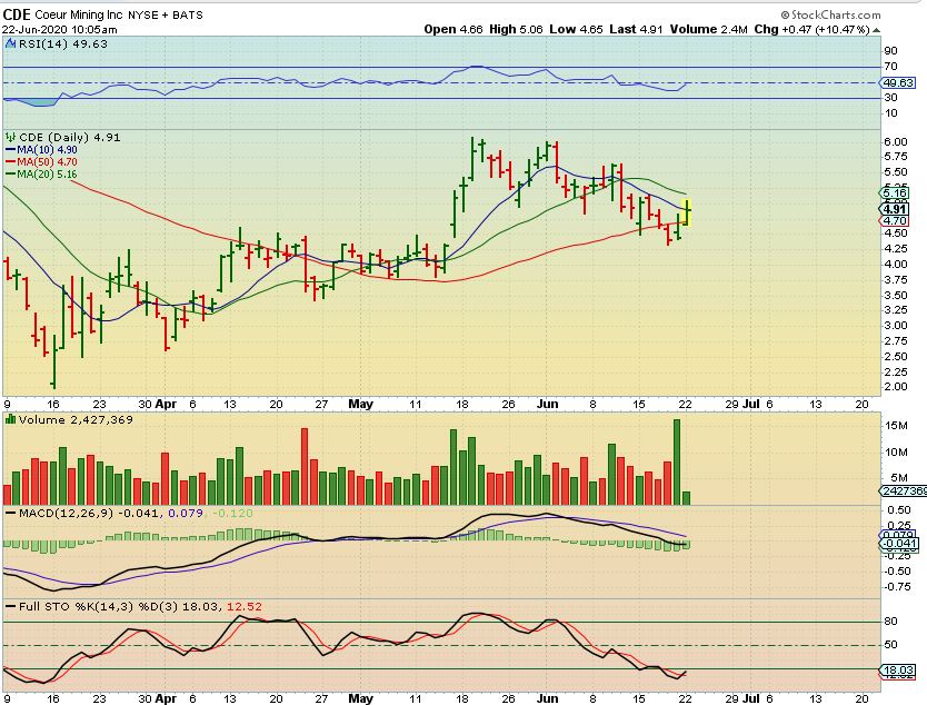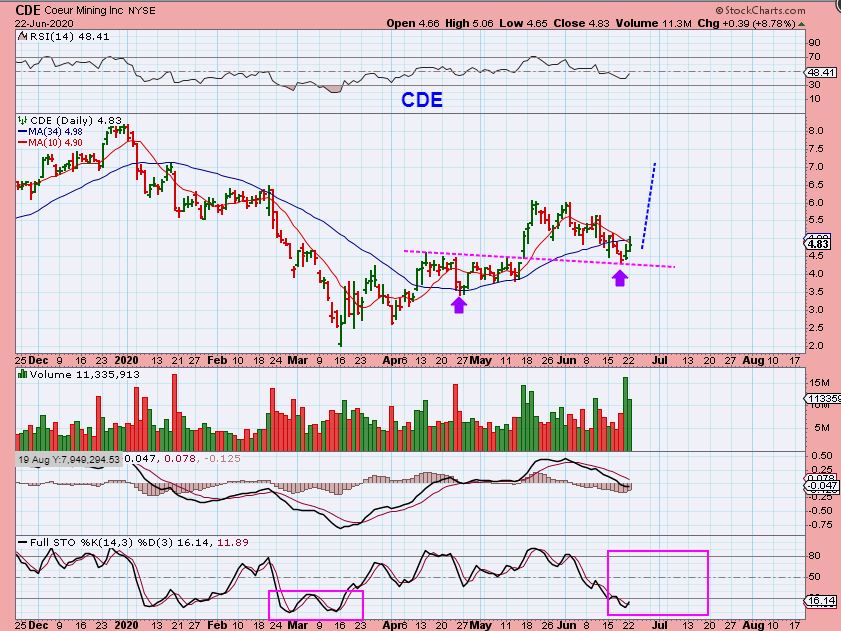 CDE also pulled back into the end of the day and closed a bit, but here I am pointing out a break out in May and a back test. Now this may be ready to break out from this consolidation too. That is great volume and a run to prior highs would be a run from $4.50 to $8. CDE is a low risk buy with a stop under the recent lows.