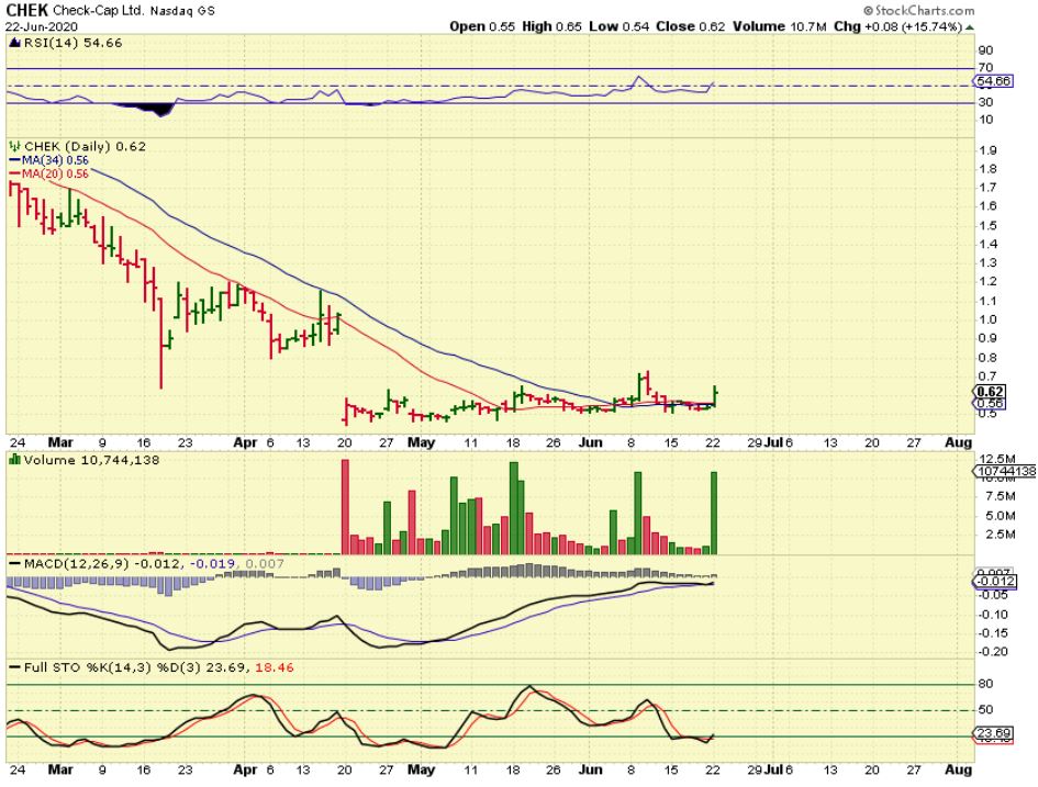 CHEK had over 10 million in volume by the close & was up about 20% at one point. I think this might be ready to go, we’ll see soon enough ( and I hope that it isn’t another false start).