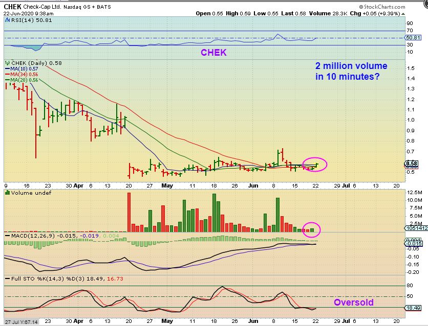 I had CHEK in a report recently as a base with high volume pops ( & good potential). It had 2 million in volume at the open, so I quickly grabbed this and posted it in the Live area at the open. It is a set up that looks ready to go higher and is also oversold…
