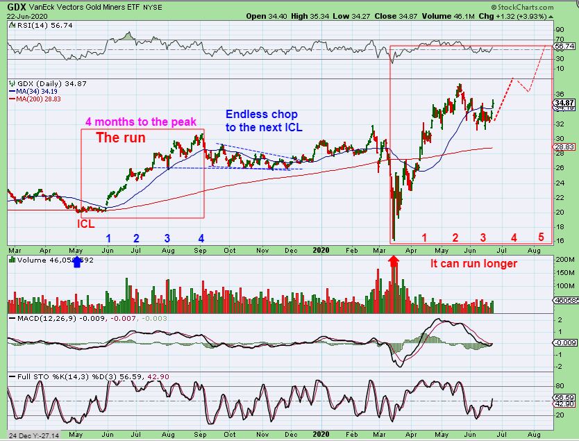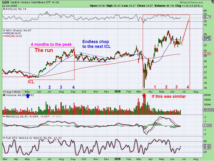GDX #2 – I took a look at our strong bull run in the summer of 2019, GDX ran from ICL to PEAK in 4 months, as seen here. Then we had a grueling slanted choppy down into the next ICL. So…