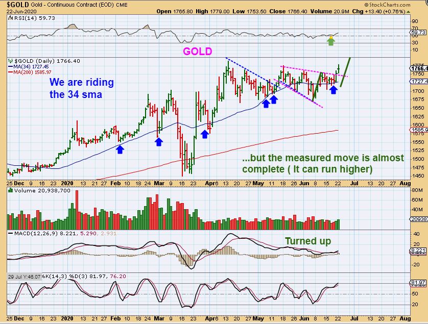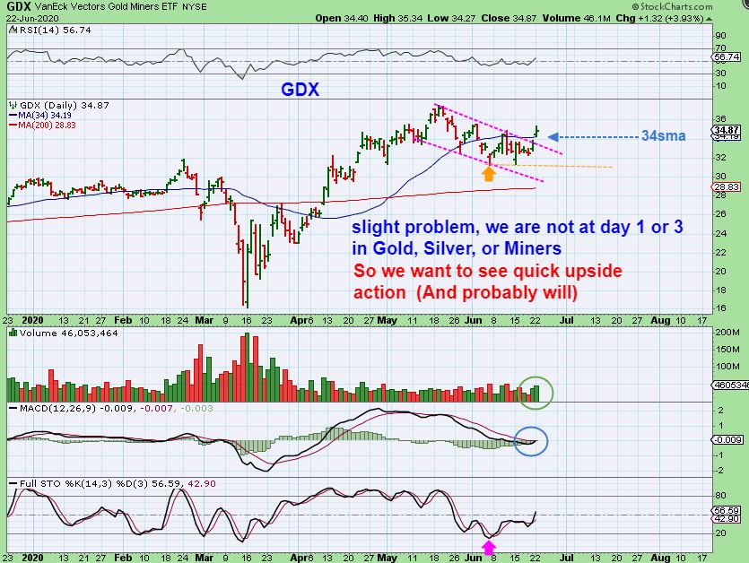 GDX #1- GDX broke higher and closed above the 34 sma. I prefer to really see price accelerate higher from here, since the lows were put in place a while ago. This is a bullish set up, and the MACD is set to cross higher . read the chart.