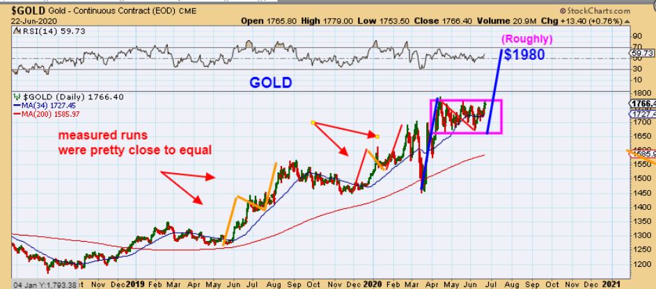 GOLD 3 of 3 – If Gold decided to do a strong run out of a multi-week consolidation, it can achieve a measured move that reaches near $2000. Look at prior runs on this chart and you’ll see how quickly Gold can do that.