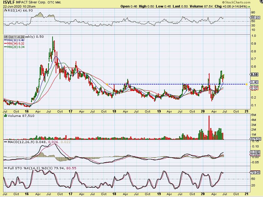 BY REQUEST ( Thanks Richard) : ISVLF– I took a look at the weekly for ISVLF and it looks rather nice. It broke from a long base and back tested on the recent dip. A run to prior 2016 highs over time is a 100% move from here.