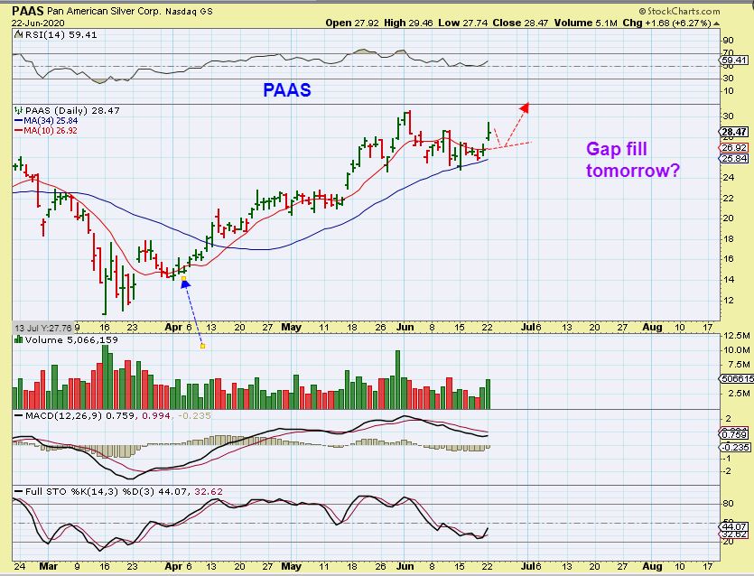 PAAS gapped up and looked great, but then it too sold off into the end of the day. It is still healthy & still bullish, but what if it drops lower tomorrow too? It may just do a gap fill, 10sma test & then run higher. This was and is a buy at this 34 sma line area. These are all oversold & should run higher.