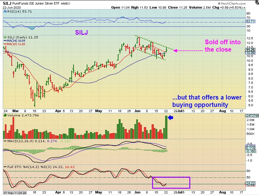 SILJ did not break out, but the volume was very good. Since Silver stocks( & SILJ) pulled back through the day, that means that if you still had some shopping to do in the Silver Stock area, price is still low and not overextended. SILJ remains oversold. I’ll discuss a few stocks at the end of the report.